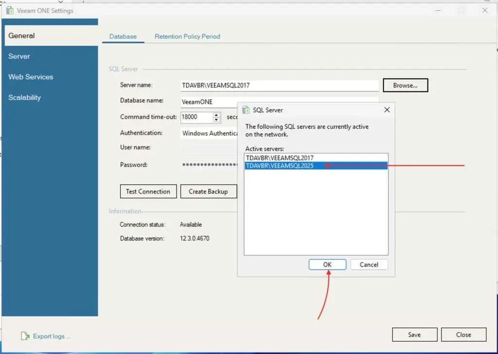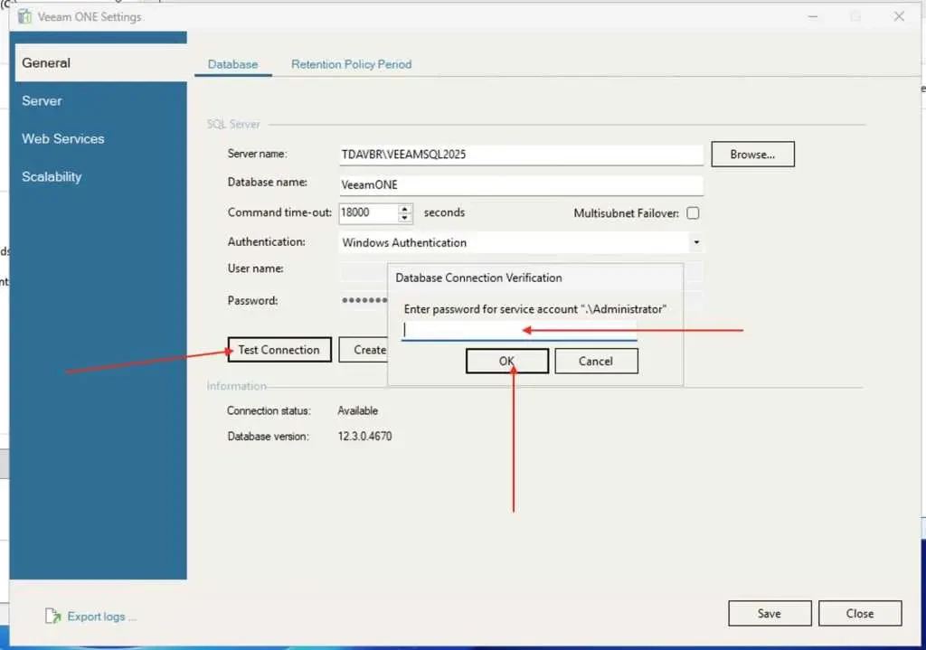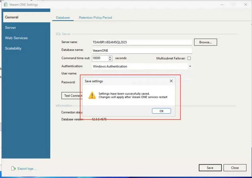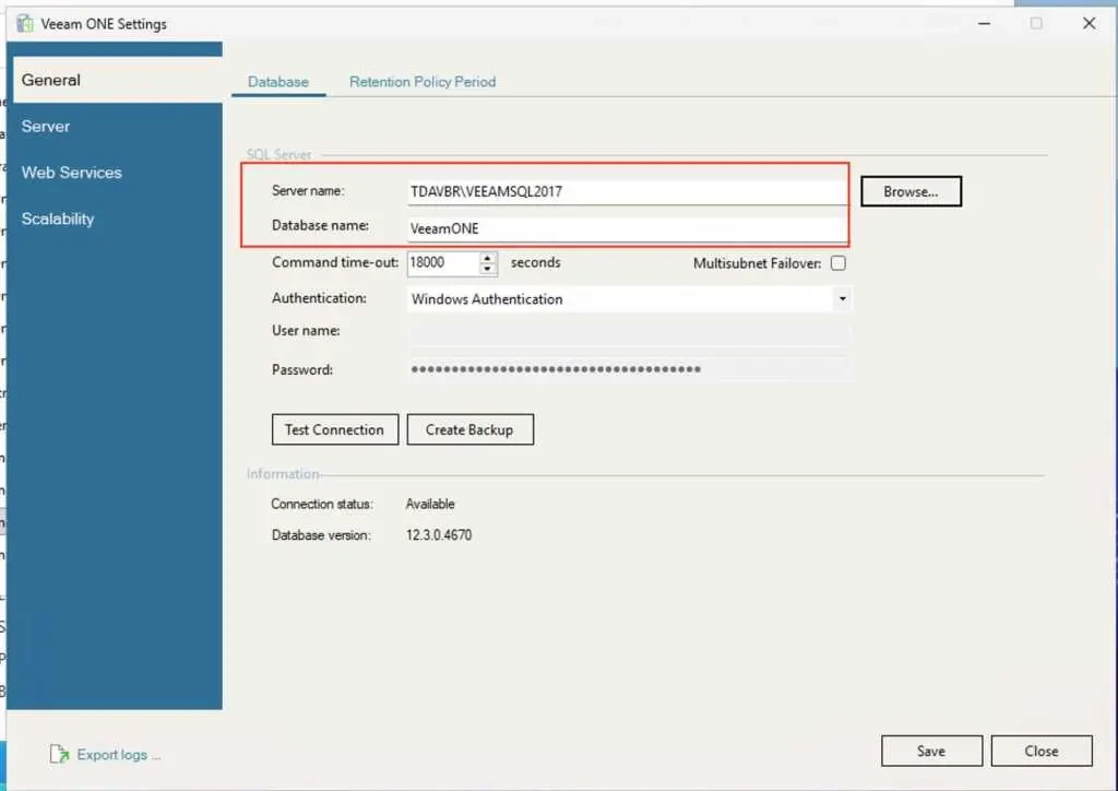Launch the Veeam ONE Settings utility. In the left menu, select General, then open the Database tab