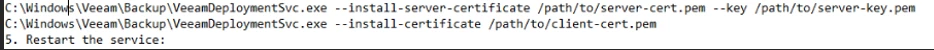 VeeamDeploymentSvc.exe –install-server-certificate C:\Windows\Veeam\Backup\certs\server-cert.pem - - key C:\Windows\Veeam\Backup\certs\server-key.pem