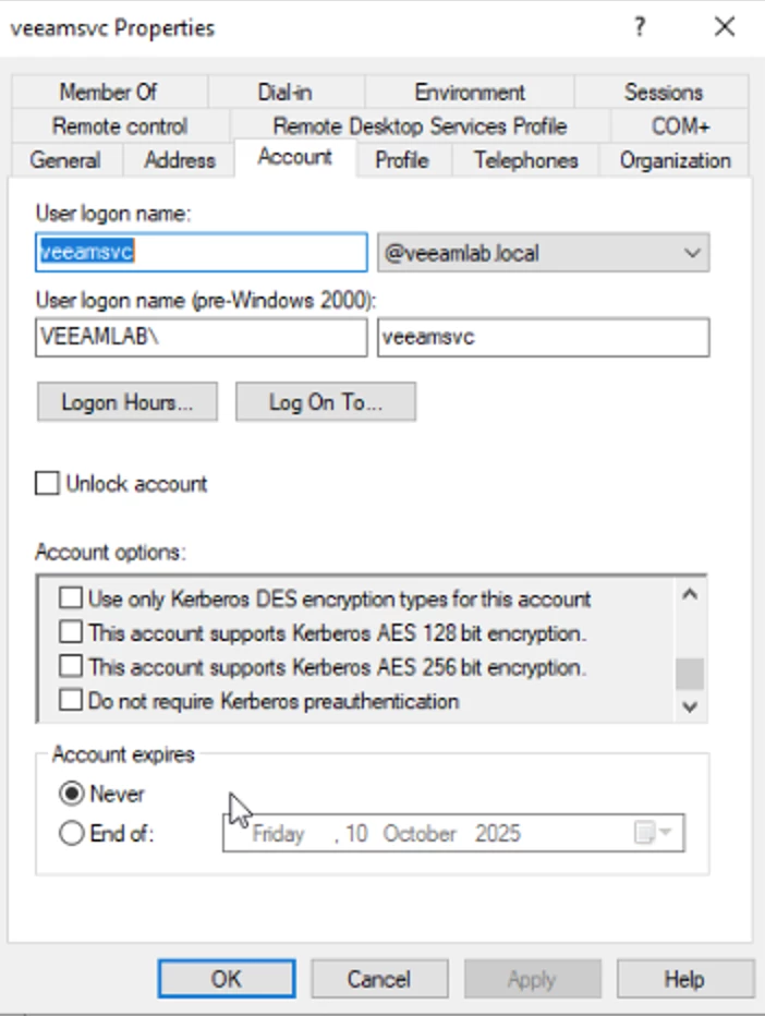 - Select your service account [we are using veeamsvc account], right click and select Properties