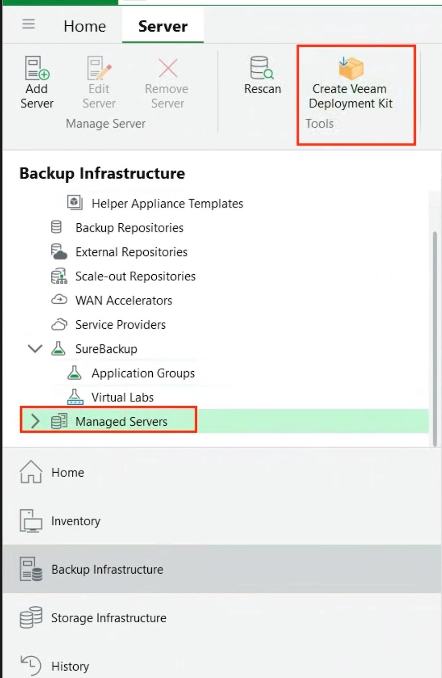 - On the Physical and Cloud Infrastructure, click “ Create Veeam Deployment Kit” icon on ribbon