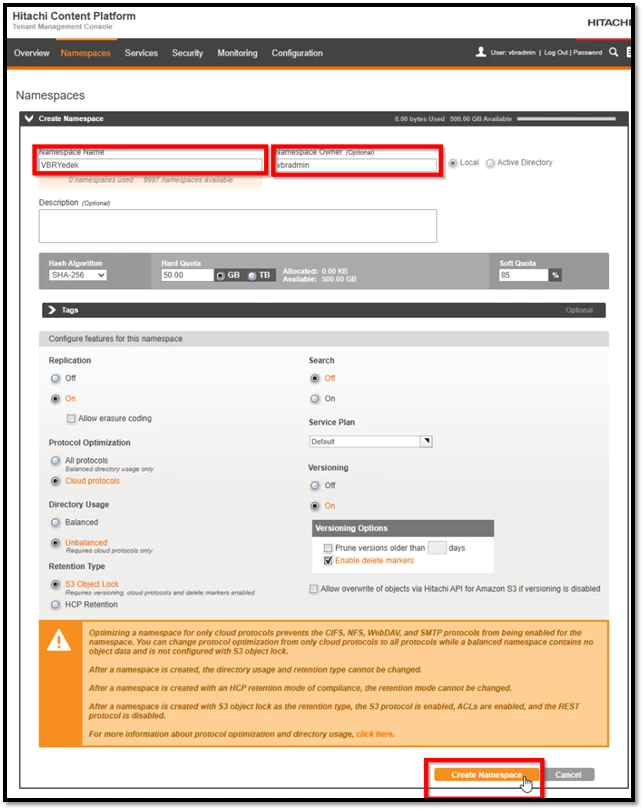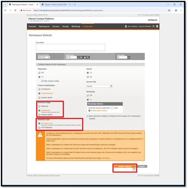 Namespace oluşturulduktan sonra, yapılandırma süreci “Settings” (Ayarlar) sekmesinden devam eder. Bu bölümde, özellikle Versioning ve Retention ayarlarının, Veeam ile uyumlu şekilde yapılandırılması kritik öneme sahiptir.