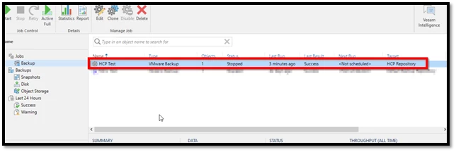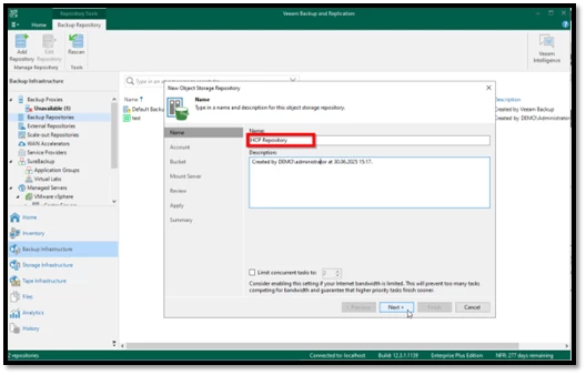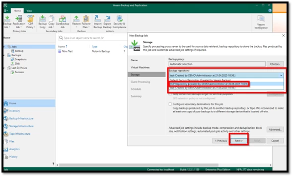 Ardından, yeni bir yedekleme job’u (backup job) oluşturulur ve Repository kısmında, daha önce oluşturduğumuz HCP Object Storage seçilir.