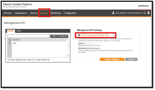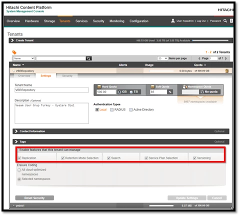 Veeam Backup & Replication ile HCP arasındaki başarılı entegrasyonun sağlanabilmesi için, namespace ayarlarında yer alan “Management APIs” seçeneğinin mutlaka aktif (enabled) hale getirilmesi gerekmektedir.