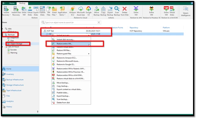 Restore işlemi için, Veeam Backup & Replication konsolunda “Object Storage” bölümü devreye girer.