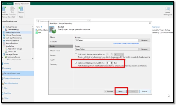 Son olarak, “Make recent backup immutable for” seçeneği ile yedeklerin değiştirilemez (immutable) olarak saklanacağı süre belirlenir.