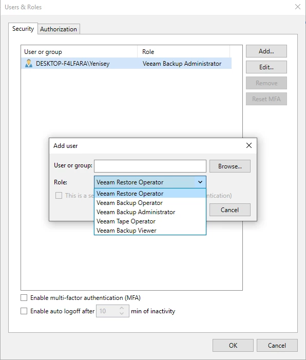 - Yedekleme oluşturma ve yönetme yetkisine ihtiyacınız olan kullanıcılar için Veeam Backup Operator rolünü kullanın.