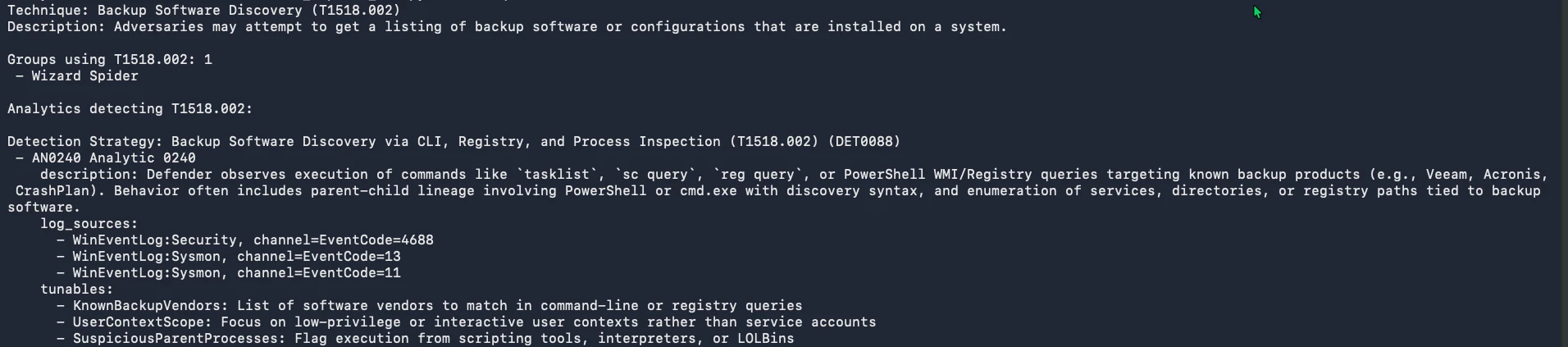 The result is structured detection guidance straight from the ATT&CK dataset, which is usable offline for quick triage, hunting, or drafting detection logic.