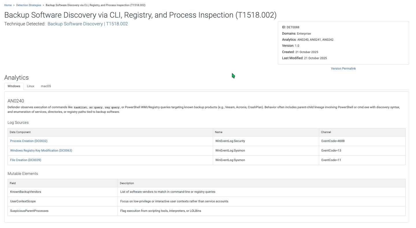 Let’s look at the Detection Strategy DET0088 “Backup Software Discovery via CLI, Registry, and Process Inspection”. This update connects techniques to the Detection Strategy, T1518.002 – Software Discovery: Backup Software Discovery. This technique describes how ransomware operators search for backup tools before launching attacks. (Remember this?)