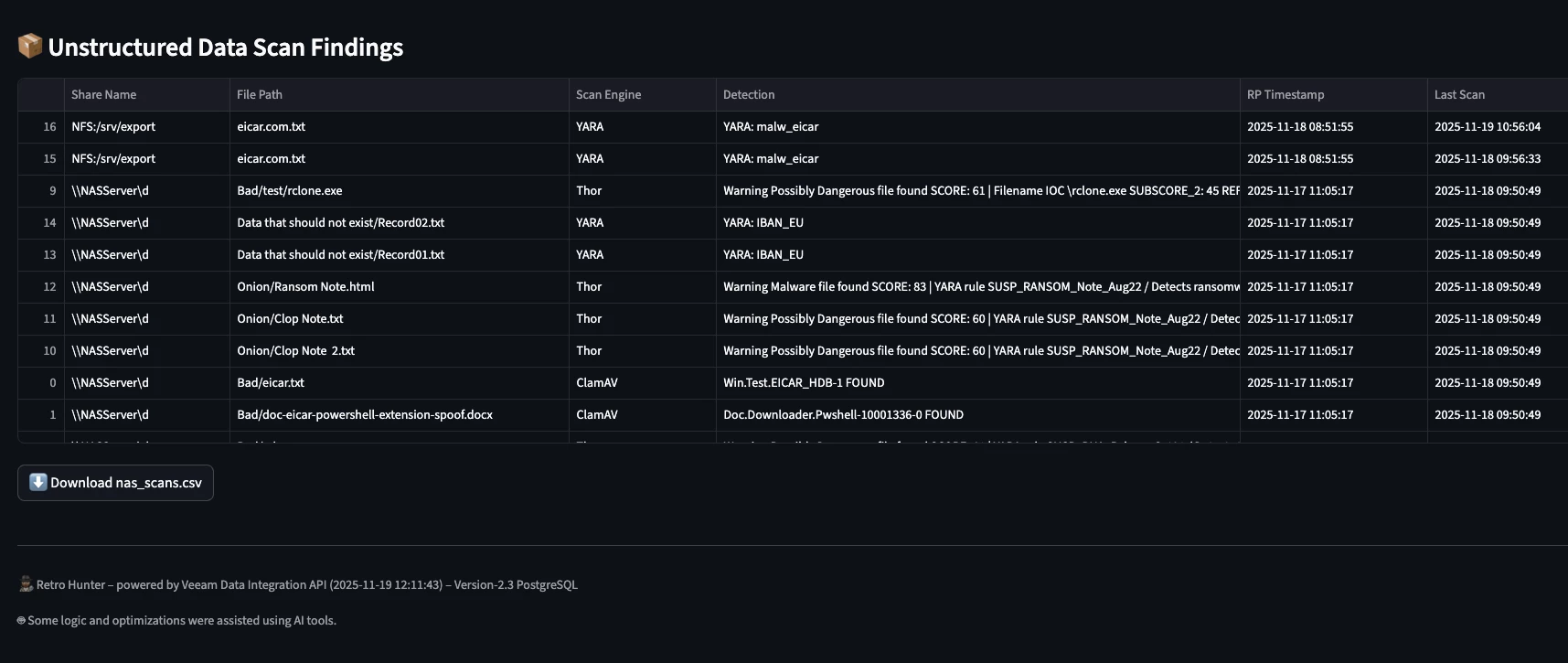 I am still considering how to integrate this script into the Retro Hunter Streamlit dashboard. The Retro Hunter script utilizes the Veeam Data Integration API, whereas the NAS script uses a different approach with Instant File Share Recovery. Additionally, I do not want to index and create hash values for all files from the Unstructured Data Backups yet; I may do that later. I would also like to keep the NAS script separate from the Retro Hunter script, but I still want the NAS data to be visible in the Retro Hunter Streamlit dashboard.